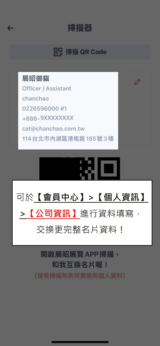 ※可於【會(huì)員中心】>【個(gè)人資訊】> 【公司資訊】進(jìn)行資料填寫,交換更完整名片資料!