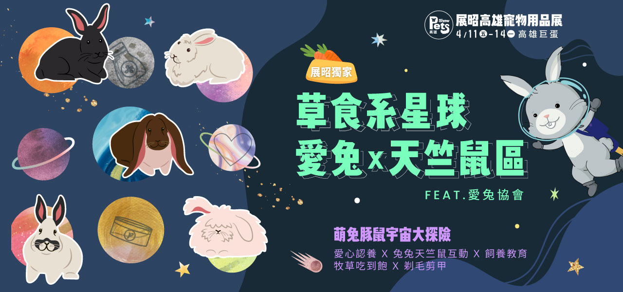 臺(tái)灣愛(ài)兔協(xié)會(huì)誠(chéng)摯邀請(qǐng)南臺(tái)灣的兔友、天竺鼠友一起來(lái)共襄盛舉參加寵宇宙草食系星球!專(zhuān)屬小動(dòng)物類(lèi)的愛(ài)兔區(qū)內(nèi)設(shè)有愛(ài)兔與天竺鼠互動(dòng)區(qū)、物資義賣(mài)、剃毛剪指甲、靜態(tài)教育展等主題區(qū)塊,透過(guò)聚會(huì)、現(xiàn)場(chǎng)互動(dòng)等方式,讓民眾可以在最短的時(shí)間內(nèi)認(rèn)識(shí)兔兔和天竺鼠等知識(shí),革除過(guò)去舊的錯(cuò)誤飼養(yǎng)觀念,讓社會(huì)大眾對(duì)特寵有更深入的瞭解喔!