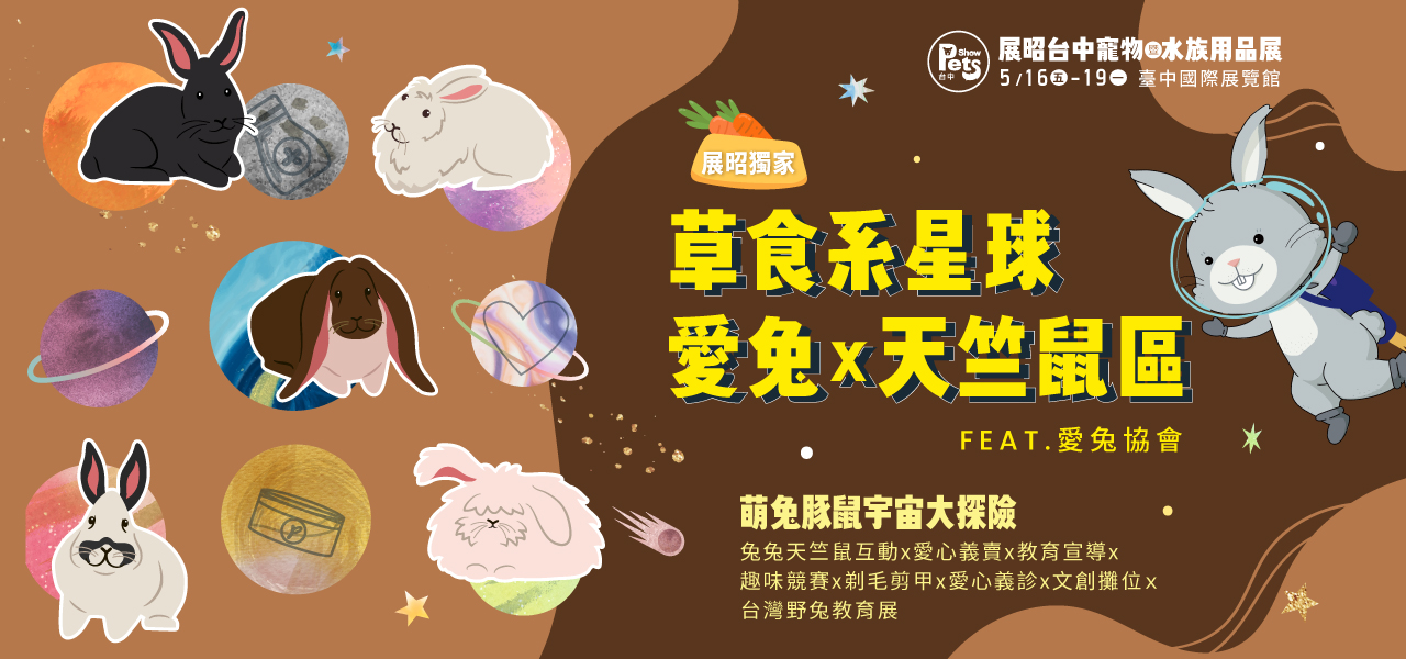中臺(tái)灣的兔友們!本屆寵物展愛兔區(qū)由臺(tái)灣愛兔協(xié)會(huì)規(guī)劃。專區(qū)內(nèi)設(shè)有兔兔友善運(yùn)動(dòng)場、兔兔及天竺鼠認(rèn)養(yǎng)、醫(yī)療義診、靜態(tài)教育等主題區(qū)塊,並透過兔奴聚會(huì)、趣味競賽等方式,讓民眾可以在最短的時(shí)間內(nèi)認(rèn)識兔兔、天竺鼠等小動(dòng)物,革除過去舊的錯(cuò)誤飼養(yǎng)觀念,讓社會(huì)大眾對兔兔和天竺鼠有更深入的瞭解喔!
